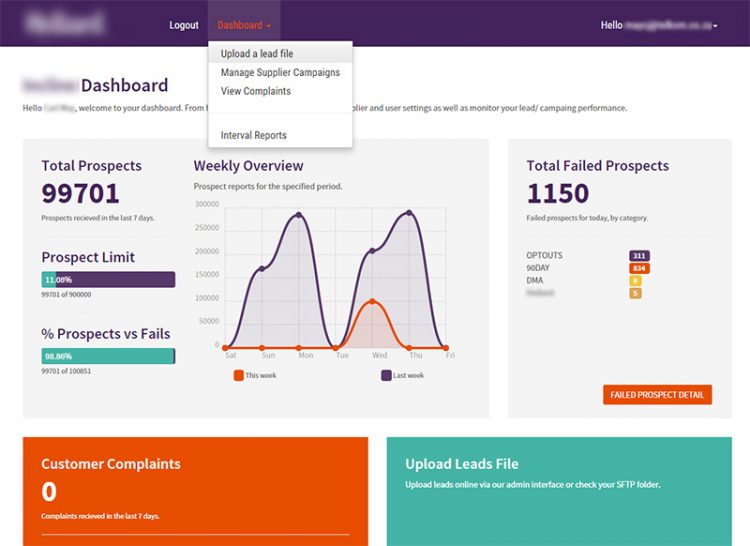 Admin users can monitor feedback on customer complaints, track the escalation progress, log complaints on the customers behalf and see which suppliers were delivering the most leads and least complaints. Suppliers login and upload their prospective leads, which are then run through the system, de-duped against multiple sources and then sent back to the supplier for them to action.